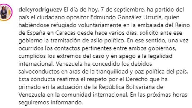 “El día de hoy, 7 de septiembre, ha partido del país el ciudadano opositor Edmundo González Urrutia, quien habiéndose refugiado voluntariamente en la embajada del Reino de España en Caracas desde hace varios días, solicitó ante ese gobierno la tramitación de asilo político”, señala el comunicado.