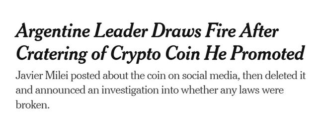 "Una coalición de centro izquierda que se opone al gobierno libertario de Milei calificó su incursión en las criptomonedas como un escándalo sin precedentes. Otro bloque político dijo que buscaba crear una comisión en el Congreso para investigar lo ocurrido", detalla el Times.