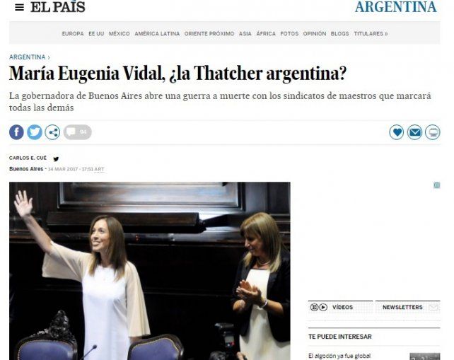 Por esto, el diario El País de España comparó a la gobernadora bonaerense, María Eugenia Vidal, con la ex primer ministro de Gran Bretaña Margaret Thatcher. Primero, por su condición de dirigente mujer; segundo, por encabezar una "lucha" contra los sindicatos peronistas.