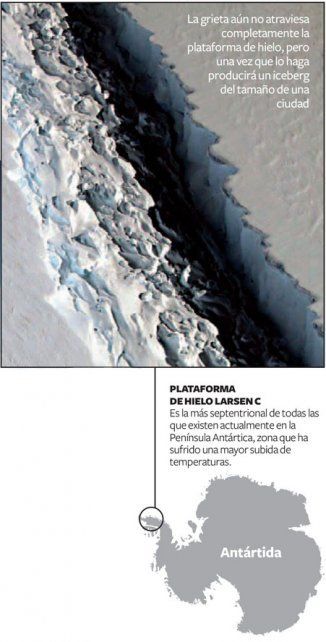 "La grieta atraviesa completamente la plataforma de hielo, pero no llega a toda ella, pero una vez que lo haga producirá un iceberg de aproximadamente el tamaño del estado de Delaware (6.500 metros cuadrados)", ha comentado la NASA en un comunicado de prensa.