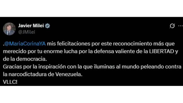“Mis felicitaciones por este reconocimiento más que merecido por tu enorme lucha por la defensa valiente de la LIBERTAD y de la democracia. Gracias por la inspiración con la que iluminas al mundo peleando contra la narcodictadura de Venezuela”, escribió el mandatario en su cuenta de X.