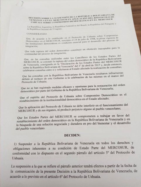 En la práctica, la decisión cambia poco y nada la situación de Venezuela en el grupo, ya que el país caribeño se encuentra suspendida del Mercosur desde diciembre de 2016.
