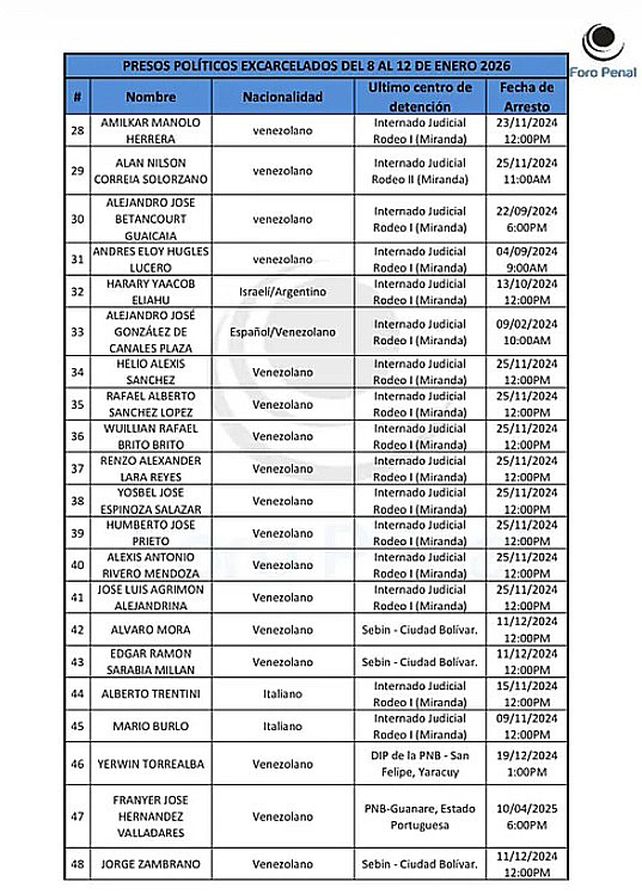 Foro Penal publicó la lista de los presos políticos que fueron excarcelados desde el 8 al 12 de enero, y allí se encuentra Harari.
