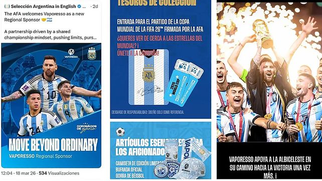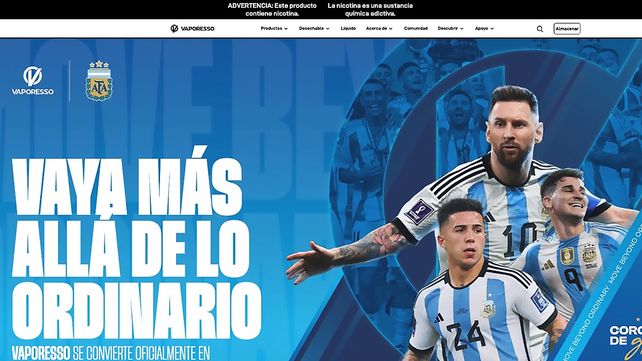 Debajo del cartel está la publicidad de la AFA con Lionel Messi a la cabeza y un concurso que invita compartir historias para tener la oportunidad de “ganar premios exclusivos”: desde entradas al mundial hasta gorras, camisetas y vasos térmicos de la Selección argentina que llevan impreso el logo de Vaporesso. Un video publicado en su cuenta de Instagram vaporesso_global -que se puede ver desde Argentina- también anuncia el acuerdo.