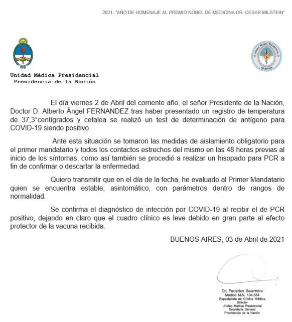La Unidad Médica Presidencial confirmó el diagnóstico de coronavirus Covid-19 positivo del presidente Alberto Fernández y aseguró que su cuadro clínico es leve. Según se confirmó oficialmente, el presidente Alberto Fernández "se encuentra estable, asintomático, con parámetros dentro de rangos de normalidad". Además, el informe indica que el cuadro "es leve debido en gran parte al efecto protector de la vacuna".