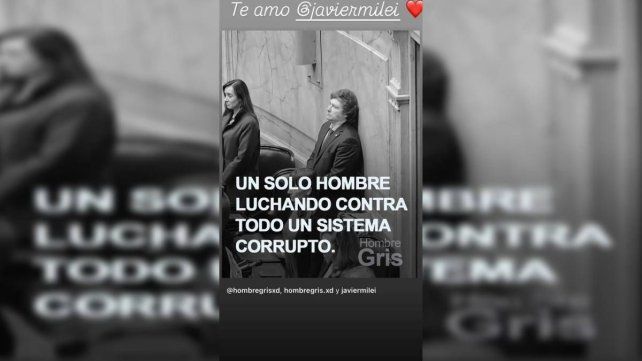 Fue vía historias de Instagram donde Yuyito González ratificó su apoyo y cariño al presidente. La misma compartió una publicación subida anteriormente por Milei en donde aparece la frase "un solo hombre luchando contra todo un sistema corrupto", haciendo alusión a que él está solo ante todos.