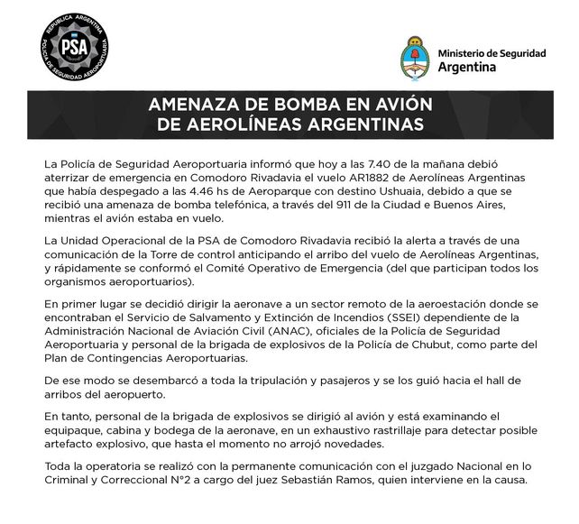 Se trata del vuelo AR1882 que a media mañana seguía en Comodoro Rivadavia mientras el escuadrón antibombas de la Policía de Seguridad Aeroportuaria realizaba el reconocimiento de equipaje, como parte de los protocolos previstos para el caso.