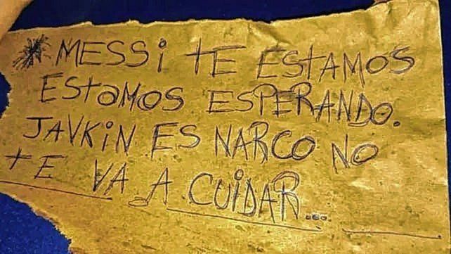 "Messi, te estamos esperando, (Pablo) Javkin es narco y no te va a cuidar", rezaba el cartel escrito con birome que dejaron los atacantes, alrededor de las 3 de la madrugada, en el frente del local ubicado en Lavalle 2554, en referencia al intendente de Rosario (en la provincia de Santa Fe).
