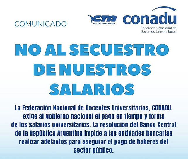 La Federación Nacional de Docentes Universitarios (Conadu) reclamó al Gobierno nacional "el pago en tiempo y forma de los salarios universitarios" y que "revierta inmediatamente" la medida por la cual el Banco Central de la República Argentina (BCRA) impide a las entidades bancarias, en este caso el Banco Nación, a realizar adelantos para asegurar el pago de haberes del sector público.