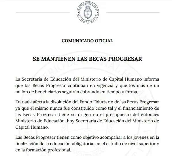 La Secretaría de Educación del Ministerio de Capital Humano informó que las Becas Progresar continúan en vigencia y que el más de millón de beneficiarios seguirán cobrando en tiempo y forma, ya que en nada afecta la disolución del Fondo Fiduciario puesto que dicho Fondo nunca fue constituido como tal y el financiamiento de las Becas Progresar tiene su origen en el presupuesto del entonces Ministerio de Educación, hoy Secretaría de Educación del Ministerio de Capital Humano.