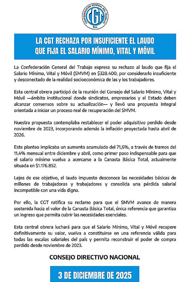 La Confederación General del Trabajo (CGT) cuestionó la resolución del Gobierno que fija el Salario Mínimo, Vital y Móvil en $328.400, al considerar que profundiza la pérdida del poder adquisitivo y se aleja del valor de la Canasta Básica Total, y reclamó una recuperación real del ingreso. "El laudo impuesto desconoce las necesidades básicas de millones de trabajadoras y trabajadores y consolida una pérdida salarial incompatible con una vida digna", expresaron.