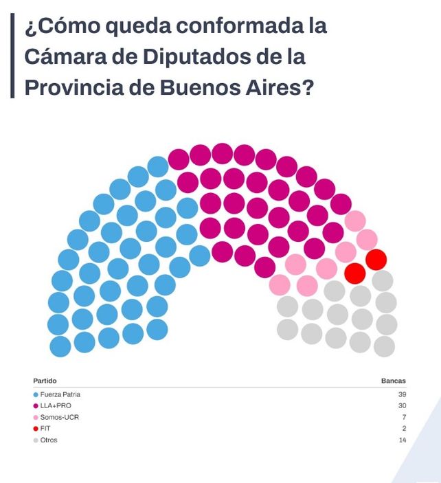 Fuerza Patria tenía 37 bancas y arriesgaba 19. Con los resultados de las elecciones, el peronismo sumó 2 y quedó con 39. Estará a 8 legisladores de alcanzar el quórum en el recinto. LLA y el PRO pasaron de 25 a 30 bancas, consolidándose como la segunda fuerza. Somos-UCR quedó con 7 y el Frente de Izquierda Unidad, con 2.