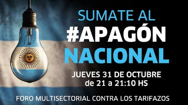 Distintos actores sociales confirmaron que el 31 de octubre, de 21 a 21.10, habrá un apagón nacional contra los tarifazos en los servicios públicos.