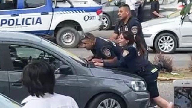 En ese momento se desata el violento accionar del conductor. Decide acelerar y embestir contra dos de los tres policías, que para evitar ser atropellados se sostienen del capot del auto y de uno de los limpiaparabrisas. Pese a que uno de los efectivos le implora a los gritos que se detenga, el joven decide acelerar su marcha y la acompañante avala el gesto: “Dale, vámonos a la mierda”.