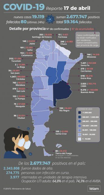 Otras 80 personas murieron y 19.119 resultaron contagiadas de coronavirus Covid-19 en las últimas 24 horas en la Argentina, con lo que la cantidad total de fallecidos desde el inicio de la pandemia se elevó a 59.164 y los infectados a 2.677.747, de los cuales 2.343.808 son pacientes recuperados.
