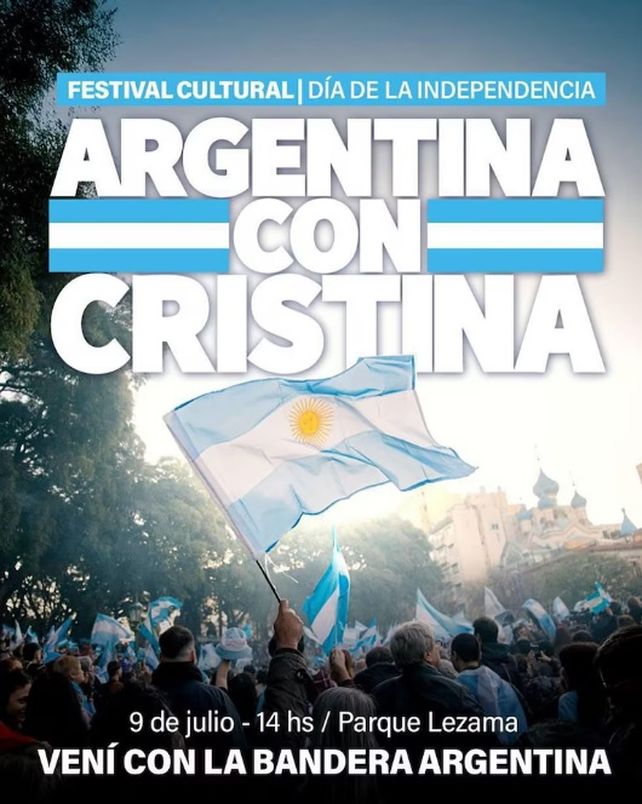 Cristina Fernández convocó este martes desde sus redes sociales a sus militantes a una celebración del Día de la Independencia que se realizará este miércoles en Parque Lezama, con la consigna “Argentina con Cristina”. La ex presidenta, además, prometió volver a comunicarse con los presentes desde su prisión domiciliaria en San José 1.111, del barrio de Constitución.