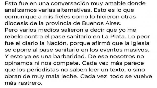 En la tarde del miércoles, el arzobispo mantuvo una reunión con la ministra de Gobierno bonaerense, Cristina Álvarez Rodríguez. Tras el encuentro, se publicó en el sitio web del arzobispado una carta dirigida a los feligreses platenses donde "quedó claro que no es competencia de la Iglesia pedir un pase sanitario para los actos de culto y realizar su control".