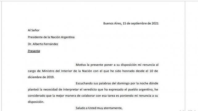 En su carta, De Pedro manifestó que "motiva la presente poner a su disposición mi renuncia al cargo de ministro del Interior de la Nación con el que he sido honrado desde el 10 de diciembre de 2019".