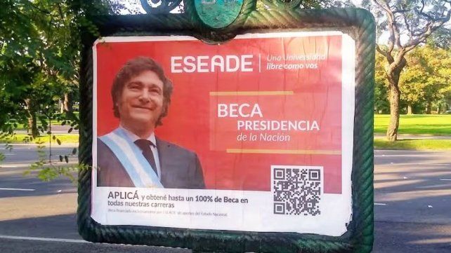 En los últimos días, la Escuela Superior de Economía y Administración de Empresas (ESEADE), institución fundada por el académico venerado por Milei Alberto Benegas Lynch (hijo), lanzó una campaña de publicidad en la vía pública de la Ciudad de Buenos Aires y en su portal web para promocionar el otorgamiento de 30 becas bonificadas para aspirantes a programas de grado y posgrado, con la singularidad de que lo hizo utilizando la imagen del presidente portando la banda (uno de los atributos de mando).
