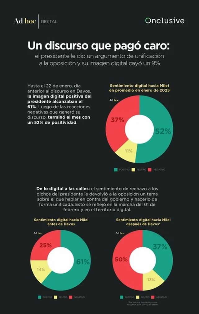 La imagen digital del presidente Javier Milei cayó un 9% después de su discurso en el Foro Económico Mundial de Davos. Según un estudio, el mandatario comenzó el año con un 61% de positividad en redes sociales, sin embargo, finalizó el mes de enero con un 52%.