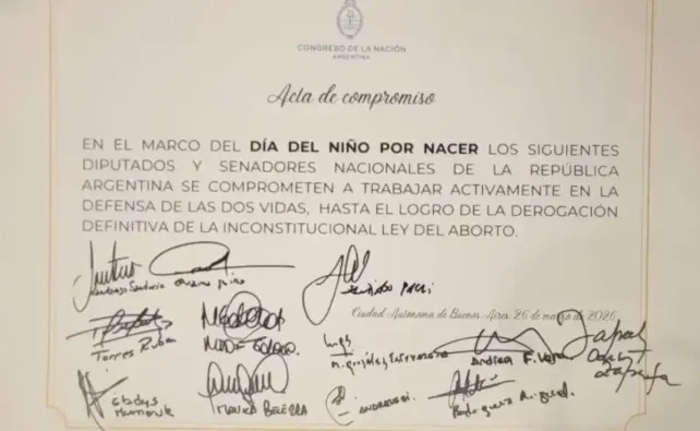 De hecho, el texto suscripto habla del compromiso de los firmantes a “trabajar activamente en la defensa de las dos vidas, hasta el logro de la derogación definitiva de la inconstitucional Ley del Aborto.