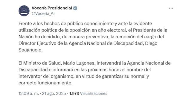 “Frente a los hechos de público conocimiento y ante la evidente utilización política de la oposición en año electoral, el Presidente de la Nación ha decidido, de manera preventiva, la remoción del cargo del Director Ejecutivo de la Agencia Nacional de Discapacidad, Diego Spagnuolo”, comunicaron durante la madrugada del jueves.
