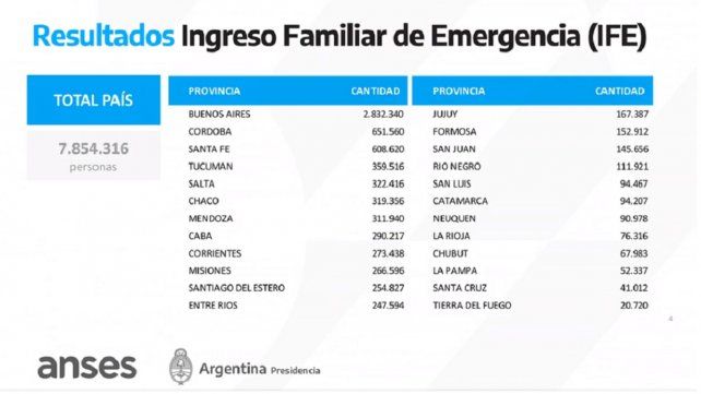 La Anses dividió en dos grupos a las personas que percibirán los $10.000. En el primero o "IFE1" incluyó a los beneficiarios de la AUH y la AUE, que suman casi 2,4 millones; mientras que en el segundo grupo o "IFE2" está compuesto por algo más de 5,4 millones.