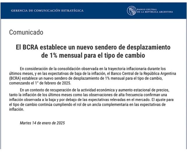 Tras conocerse la inflación anual, Banco Central de la República Argentina (BCRA) anunció un nuevo sendero de ajuste para el tipo de cambio oficial, que pasará de una devaluación mensual del 2% al 1%.