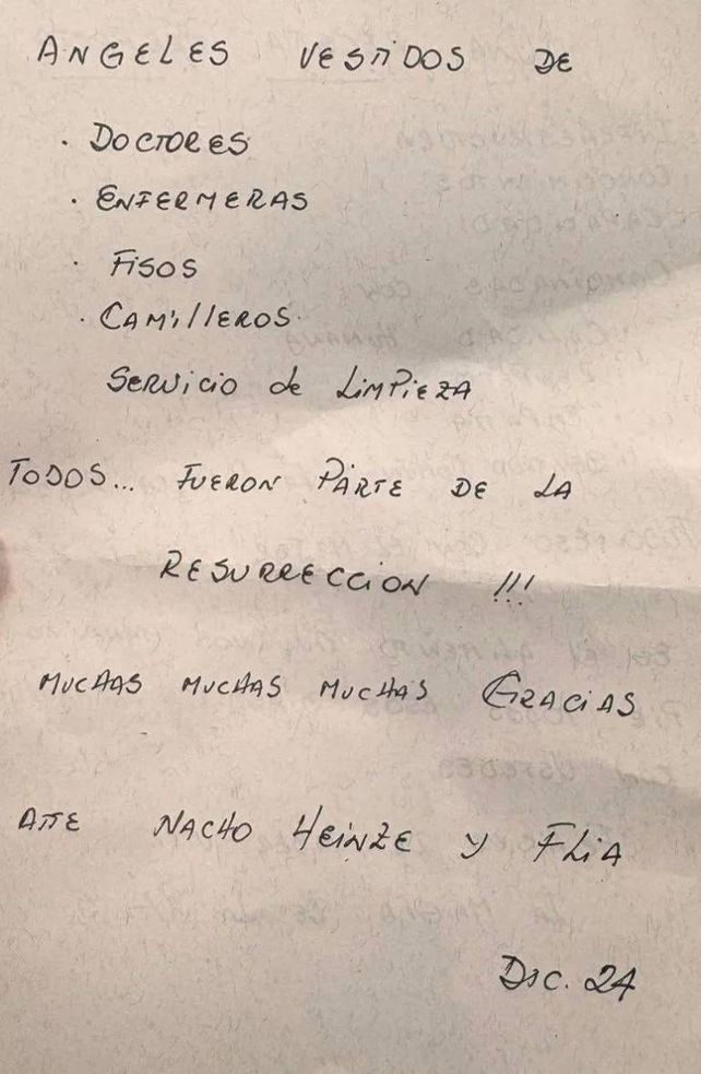 "Ángeles vestidos de vestidos de médicos, enfermeros, fisioterapeutas, personal de limpieza, entre otros. Todos fueron parte de la Resurrección. Muchas, muchas, muchas gracias. Atte. Nacho Heinze y familia".