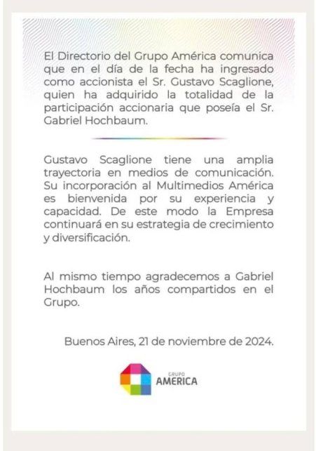 El Directorio del Grupo América comunicó el ingreso como accionista del empresario Gustavo Scaglione, quien adquirió la totalidad de la participación accionaria que poseía el Gabriel Hochbaum.