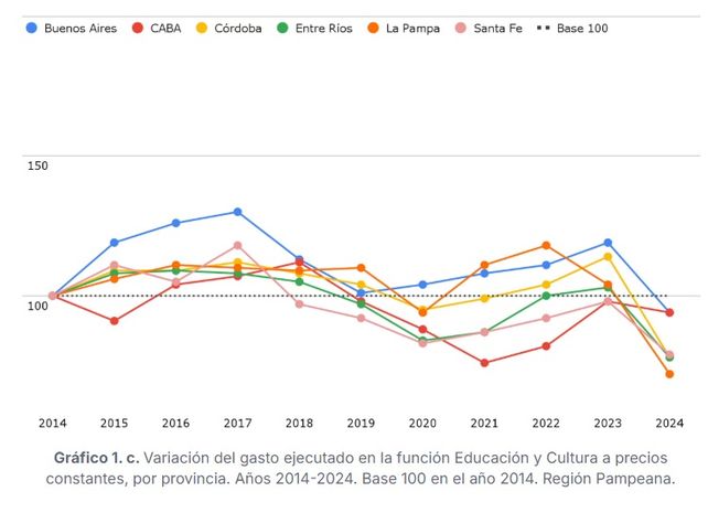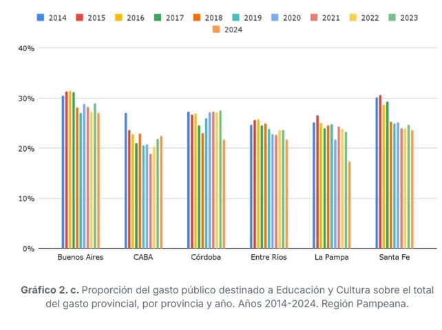La Región Pampeana registró caídas generalizadas en el gasto de la función Educación y Cultura en 2024 respecto a 2023, y todas sus jurisdicciones presentan niveles de gasto inferiores a los de 2014. En el análisis de largo plazo (2014-2024), todas las provincias exhiben una reducción en la proporción del gasto destinada a educación. Todas las provincias de la región presentan salarios docentes inferiores a los de 2014. Aunque Córdoba y Entre Ríos mostraron una recuperación salarial entre 2024 y 2025, todas las provincias continuaron con salarios por debajo de los niveles de 2023.