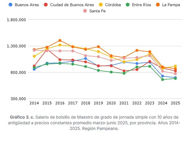 En esta estructura educativa, el informe advierte que los salarios docentes en junio de 2025 son más bajos que hace 10 años en 21 provincias argentinas. Sólo Chaco, Santiago del Estero y Río Negro muestran salarios más altos en 2025 que en 2014, aunque el aumento es de entre un 2% y un 4%.