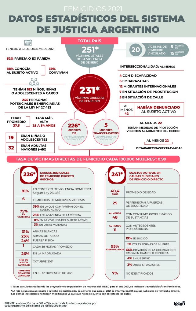 Un total de 251 femicidios, entre ellos 20 vinculados, y cinco trans-travesticidios, fueron cometidos en el país durante el 2021, lo que promedia un crimen con motivos de género cada 35 horas y representa un 13% menos a la cantidad de casos registrados en el 2020, según un informe del Registro Nacional de Femicidios de la Justicia Argentina realizado por la Oficina de la Mujer (OM) de la Corte Suprema de Justicia de la Nación (CSJN).