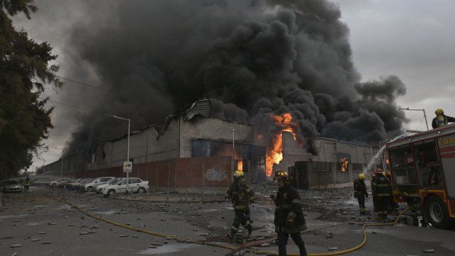 Las cámaras de TV también registraron el momento exacto en que se produjeron varias explosiones dentro de un galpón lindero, donde funciona una fábrica de aerosoles, que provocó el derrumbe de su techo.