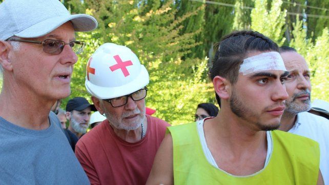 A pesar de los intentos, con piedras y hasta con una amoladora, no pudieron derribar las rejas y se produjeron forcejeos entre los peones y los manifestantes. Uno de estos últimos resultó un herido en la cara a causa de un piedrazo lanzado por parte de los peones rurales que responden a Lewis, consignó la agencia Télam. En el camino se encontraban por lo menos 25 peones montados a caballos y varios otros a pie, con rebenques y gomeras, y llegaron a tirar gas pimienta.