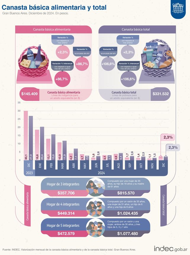 El nivel general del Índice de Precios al Consumidor registró un alza mensual de 2,7% en diciembre de 2024 y acumuló en el año una variación de 117,8%, según los datos que entregó el Indec en la tarde de este martes.