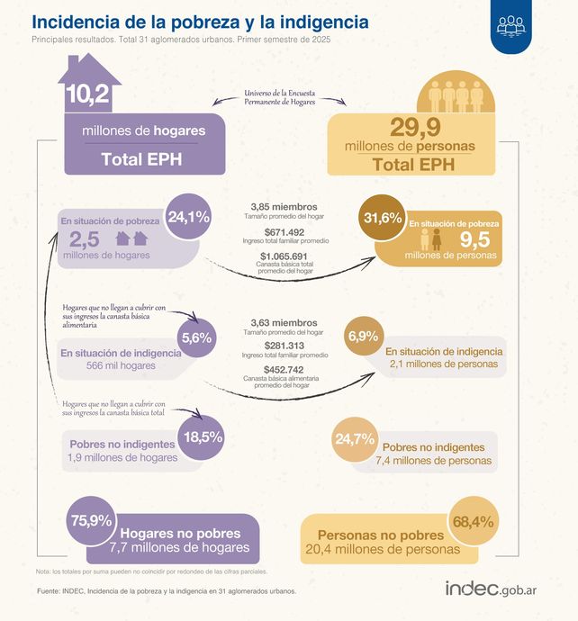 El Indec informó este jueves que la pobreza bajó 6,5 puntos porcentuales en el primer semestre del año respecto del segundo semestre de 2024, y afectó al 31,6% de las personas. La proporción de hogares por debajo de la línea de pobreza se ubicó en el 24,1%, donde reside el 31,6% de la población.