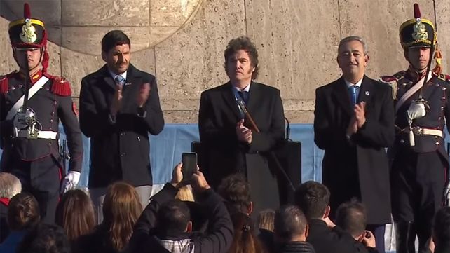 El presidente de la Nación encabezó el acto oficial en la ciudad de Rosario acompañado por el gobernador santafesino, Maximiliano Pullaro y al intendente de la ciudad, Pablo Javkin, en el Monumento Nacional a la Bandera donde izó la insignia patria acompañado de la canción Aurora, ejecutada por la Fanfarria Alto Perú del Regimiento de Granaderos a Caballo y luego se entonó el himno nacional.