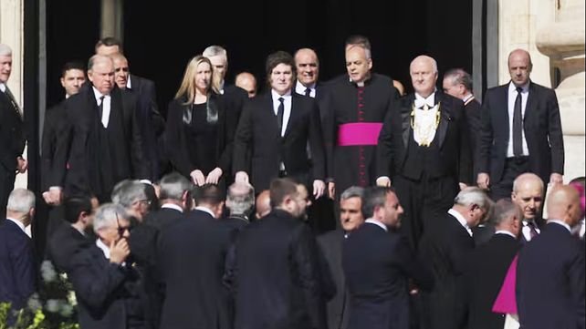 Durante el funeral, Milei encabezó la delegación argentina junto a su hermana Karina Milei, y estuvo ubicado junto a Meloni, quien estuvo acompañada por el presidente de Italia, Sergio Mattarella.