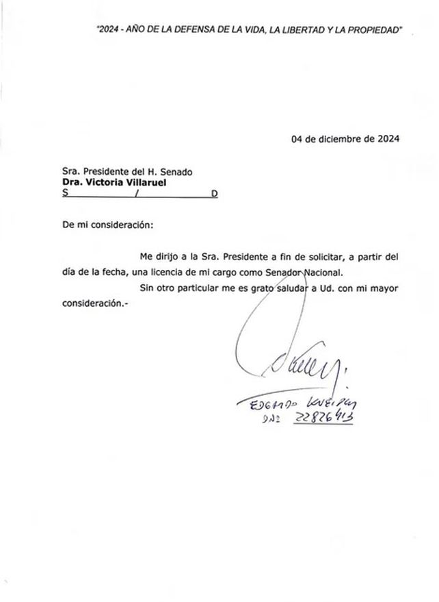 Por medio de una carta dirigida a la vicepresidenta Victoria Villarruel, el legislador entrerriano Edgardo Kueider pidió formalmente el cese de sus tareas.