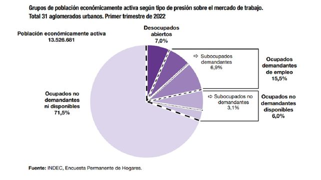 El Indec detalló que en el primer trimestre de 2022, la tasa de actividad (TA) –que mide la población económicamente activa (PEA) sobre el total de la población– alcanzó el 46,5%, la tasa de empleo (TE) –que mide la proporción de personas ocupadas con relación a la población total– se ubicó en 43,3%; y la tasa de desocupación (TD) –personas que no tienen ocupación, están disponibles para trabajar y buscan empleo activamente, como proporción de la PEA– se ubicó en 7,0%.