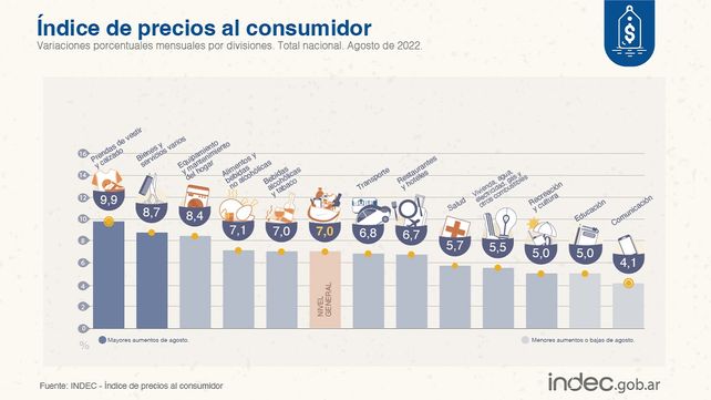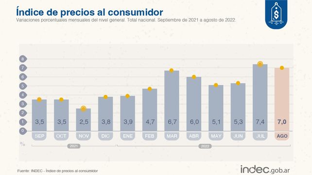 El informe del Indec señala que el nivel general del Índice de precios al consumidor (IPC) aumentó 7,0% mensual en agosto de 2022, y acumuló una variación de 56,4% en los primeros ocho meses del año. En la comparación interanual registró un incremento de 78,5%.