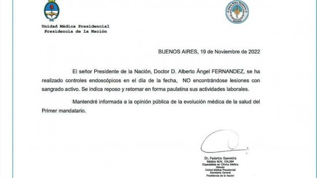 "El señor Presidente de la Nación, Doctor D. Alberto Ángel Fernández se ha realizado controles endoscópicos en el día de la fecha, NO encontrándose lesiones con sangrado activo. Se indica reposo y retomar en forma paulatina sus actividades laborales. Mantendré informada a la opinión pública de la evolución médica de la salud del primer mandatario", dice un parte difundido este mediodía, firmado por el médico Federico Saavedra.