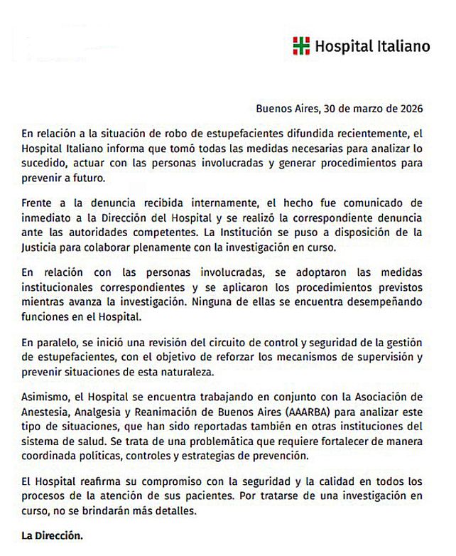 A nivel institucional, el Hospital Italiano confirmó el robo de estupefacientes en el área de anestesiología y procedió a la desvinculación inmediata de los implicados. Asimismo, la entidad ha reforzado los controles internos y colabora con la Asociación de Anestesia, Analgesia y Reanimación de Buenos Aires (AAARBA) para prevenir la replicación de estos protocolos de desvío en otros centros de salud.