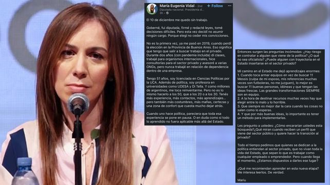 “Todo el tiempo pedimos que quienes se dedican a la política entiendan al sector privado, que no vivan toda la vida del Estado, que sepan lo que es trabajar como cualquier empleado o emprendedor”, afirmó Vidal y concluyó: “Pero cuando llega el momento, ¿Estamos dispuestos a darles ese lugar?¿Qué me recomiendan aprender en esta nueva etapa? Me interesa leerlos. De verdad. Mariu”.