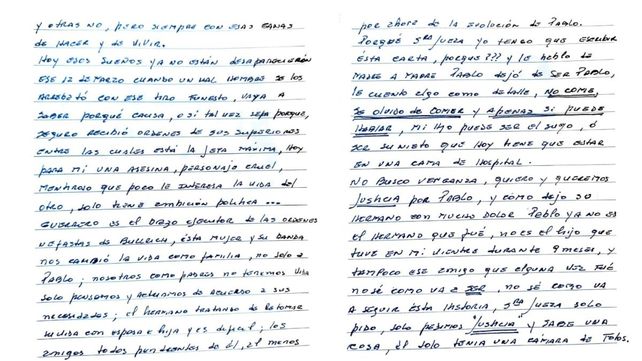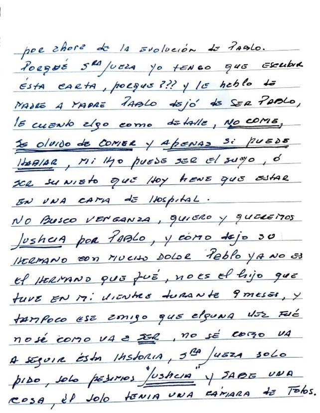 En ese sentido, amplió que su círculo de amigos están pendientes de su salud al igual que su hermano, que tiene su propia familia también. "¿Por qué señora jueza yo tengo que escribir esta carta? (...) Pablo dejó de ser Pablo, le cuento algo como detalle: no come, se olvidó de comer, y apenas puede hablar. Mi hijo puede ser el suyo o su nieto", reflexionaba la mujer.