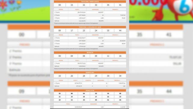 En el sorteo Tradicional salieron los siguientes números: 00-15-22-33-35-41. Al no haber ganador, el pozo acumuló para el próximo sorteo la suma de $284.378.323