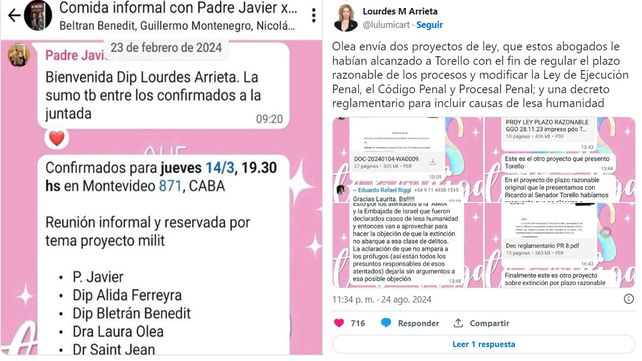 Cuenta Arrieta que ese grupo fue convocado a una “reunión reservada por tema proyecto milit (SIC) y se enumeran los confirmados diputados y los abogados Ricardo Saint Jean, Laura Olea, el ex juez de la Casación destituido por supuestos cobros de coimas y vinculado a agentes de la SIDE, Eduardo Riggi”.
