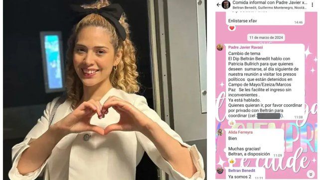 Es cuando señala que “el 11 de marzo informa: ‘Cambio de tema. El dip. Beltrán Benedit habló con Patricia Bullrich para quienes deseen sumarse, al día siguiente de nuestra reunión a visitar a los presos políticos que están detenidos en Campo de Mayo//Ezeiza/Marcos Paz, se les facilite el ingreso sin inconvenientes. Ya está hablado. Quienes quieran ir por favor coordinar por privado con Beltrán para coordinar…”.