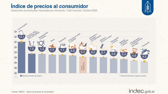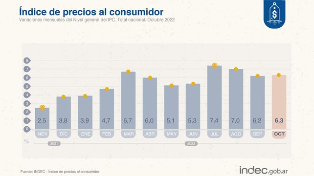 El Indec dio a conocer que el Índice de Precios al Consumidor (IPC) fue de 6,3% en octubre de 2022 respecto de septiembre y 88% interanual. Los precios acumularon un alza de 76,6% en los primeros diez meses del año.
